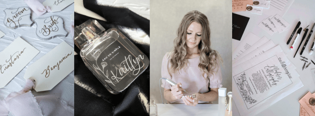 She specializes in modern hand-lettered wedding signage, lettering workshops, and on-site personalization for weddings, live events, and brand activations via engraving and calligraphy.