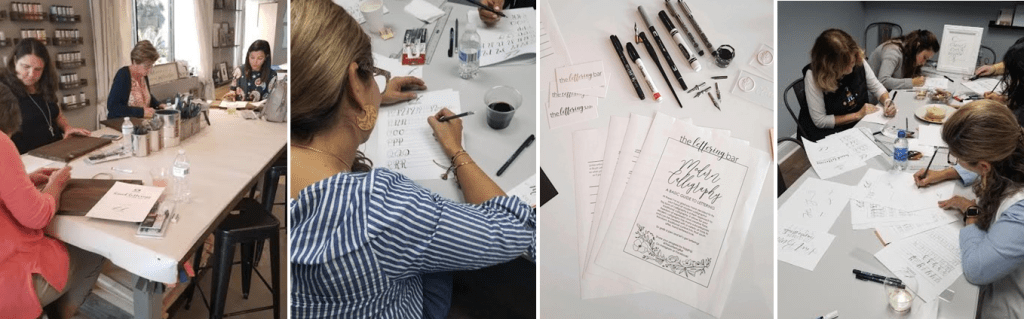 All materials are included to learn the basics of modern brush calligraphy, including a practicing lettering packet, lettering pens and a take-home item.
